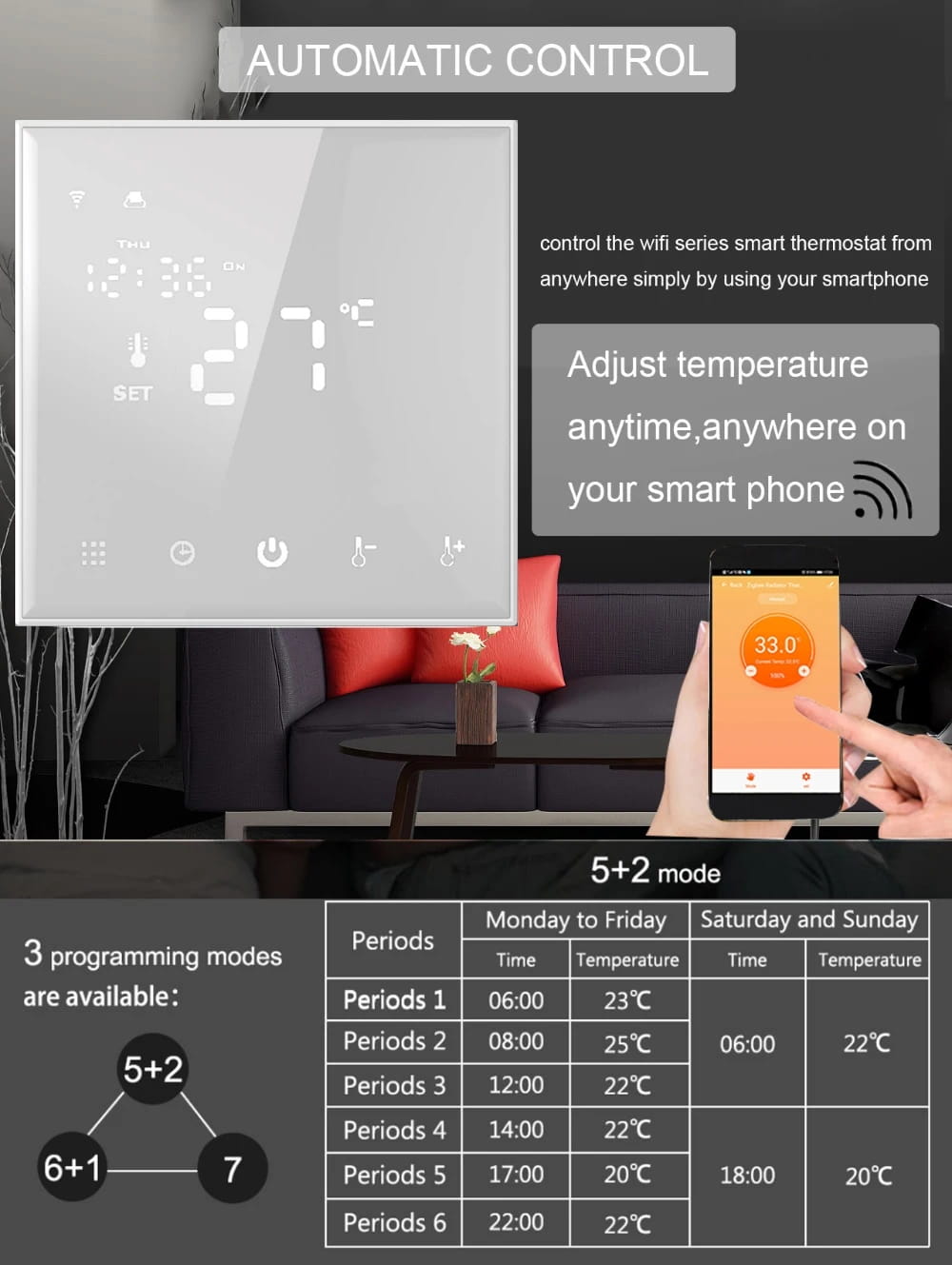 Termostat obsługuje różne ustawienia temperatury odpowiednio z Programowalne 5+2,6+1,7 dni z 6 trybami czasu dziennie.