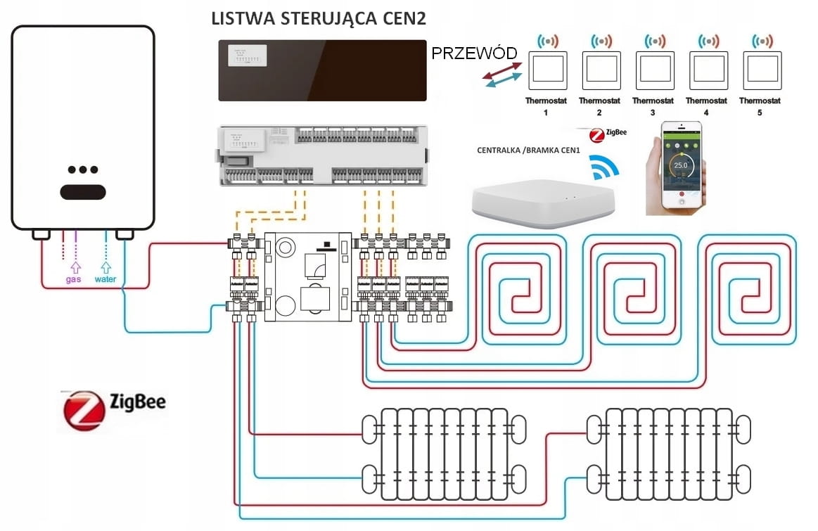Współpracuje z przewodową listwą ogrzewania podłogowego CEN2 / CEN2P ( dostępne na naszej aukcji) , możliwość tworzenia zestawów do ogrzewania podłogowego.