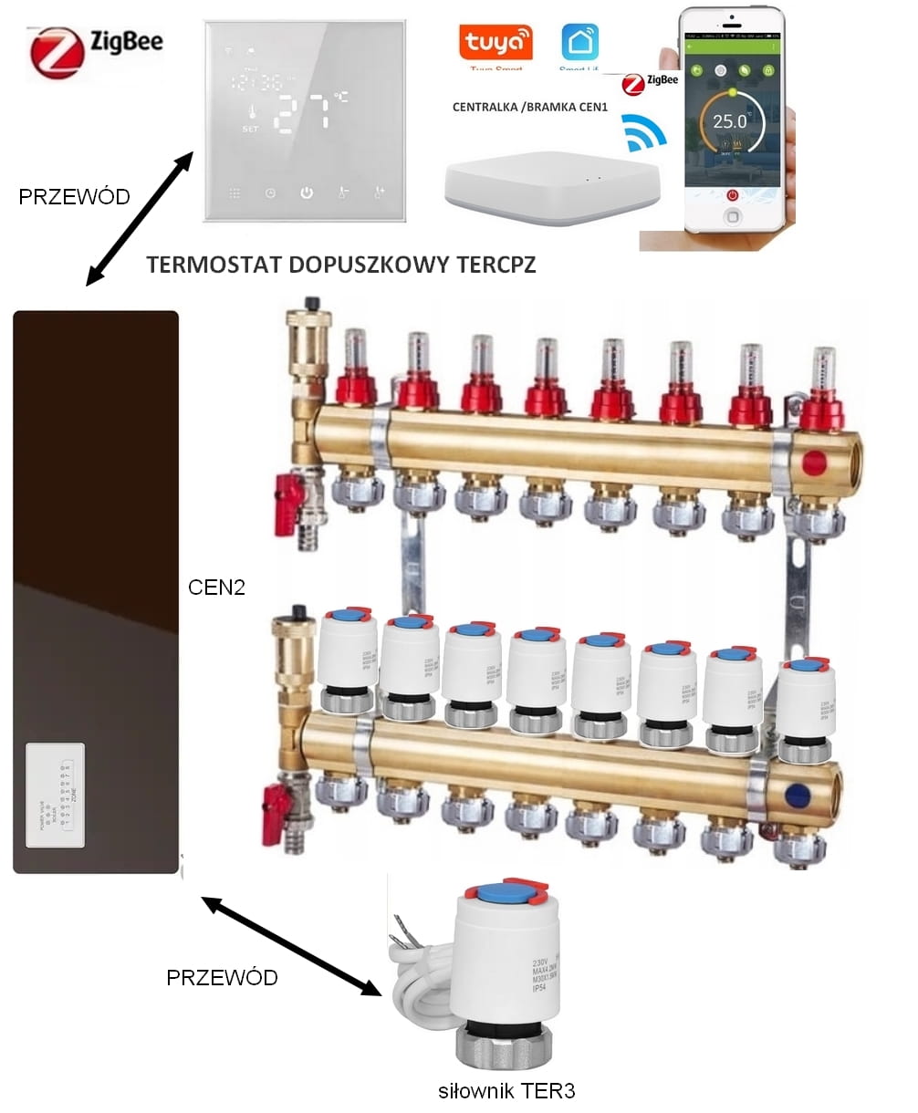 Do stworzenia zestawu bezprzewodowego działającego w jednym ekosystemie app TUYA niezbędna jest BRAMKA / CENTRALKA CEN1 dostępna w naszej ofercie ale jeśli nie potrzebujesz zdalnego sterowania przez internet wystarczy dobrać urządzenia z innych naszych aukcji takich jak termostat dopuszkowy TERSCPZ + siłownik TER3P + centrala sterująca CEN2P/CEN2