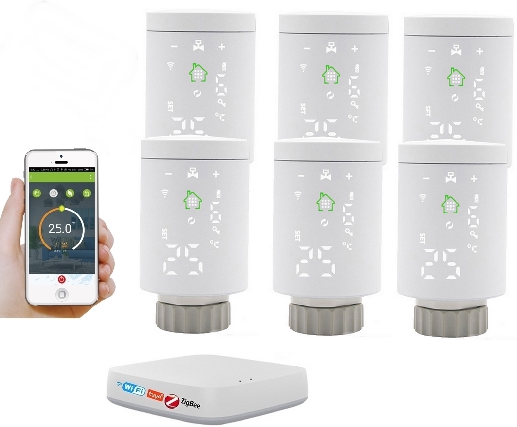 ZESTAW TUYA ZigBee 6 x GŁOWICA TERMOSTAT + CENTRALA WIFI
